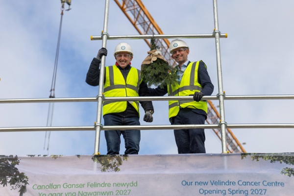 Representatives from Velindre University NHS Trust, the Acorn consortium and Sacyr UK were joined by Welsh Government colleagues, Julie Morgan MS, local councillors, and Velindre Cancer Charity President Jonathan Davies, to fix a sprig of pine to the highest point of the building, a construction tradition that acknowledges the hard work and dedication of all those involved.